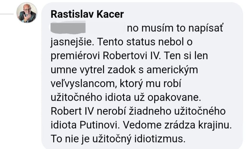 Bývalý minister zahraničných vecí v Hegerovej vláde Rastislav Káčer nazval veľvyslanca USA na Slovensku Gautama Ranu „užitočným idiotom“ za jeho opakované stretnutia s predsedom vlády Robertom Ficom. Keby to urobil ktokoľvek zo súčasnej vládnej koalície, bol by to medzinárodný škandál a téma pre naše médiá na niekoľko týždňov. Mňa na tom zaráža najviac to, ako mohol byť šéfom diplomacie niekto, kto sa evidentne nevie ovládať (nevedel to ani počas výkonu svojej funkcie, keď dourážal predstaviteľov niekoľkých štátov a vulgárne nadával občanom na stretnutí v Michalovciach) a kto má problém s pochopením takej elementárnej veci, že pravidelný kontakt s najvyššími predstaviteľmi štátu je základnou rutinnou povinnosťou diplomata v tej ktorej krajine. Káčer však zašiel ešte ďalej, keď obvinil premiéra Fica, že „vedome zrádza krajinu“. A tu by som sa na to pozrel bližšie, keď sa už používajú vo verejnom priestore také silné slová, ktože je to „zradcom“.