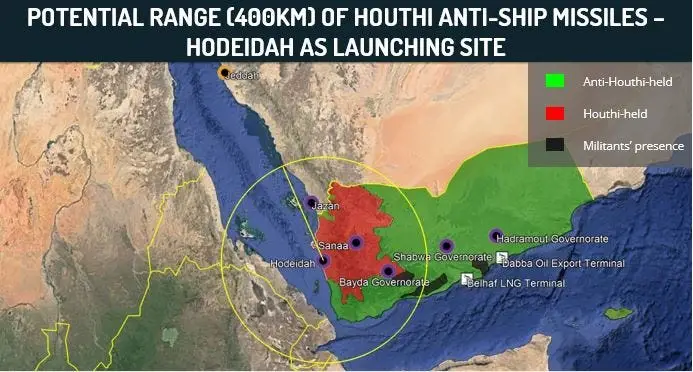 Keďže arzenál Húsíov je veľmi úzko spätý s Iránom, nasledujúca grafika ukazuje schopnosti pôvodných iránskych protilodných rakiet. Je zrejmé, že strategická hodnota týchto zbraní je obrovská: Hormuzský prieliv, Perzský záliv a Ománske more sú účinne pokryté. Akýkoľvek pokus preniknúť do nich v prípade vojny by nebol ničím iným ako mimoriadne riskantným pokusom. Dokonca aj mocná skupina amerických nosičov bola nútená vypariť sa mimo dosahu.