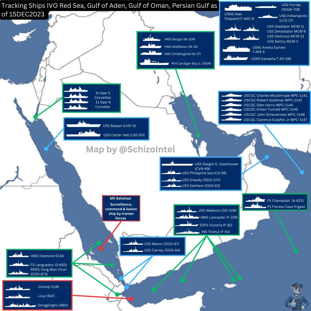 Lode okolo Jemenu: Mimoriadne zaujímavé sú čínske lode v Adenskom zálive a iránska dozorná, veliteľská a spojovacia loď v Červenom mori. Keď poskytujú informácie potrebné na presné zameranie, spojenci (v tomto prípade len lode amerického námorníctva) sú veľmi exponovaní.