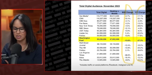 V prehľade počtu jedinečných návštevníkov médií (obrázok nižšie), so započítaním všetkých ich platforiem vrátane sociálnych sietí, zaznamenali všetky médiá medziročne katastrofálny úbytok čitateľov. Vlajkové lode mainstreamu, ktoré určovali celkový tón verejnej komunikácie médií aj u nás na Slovensku, majú úbytky najvýraznejšie. CNN – 20 %, Washington Post – 27 % a Politico dokonca – 34 %.