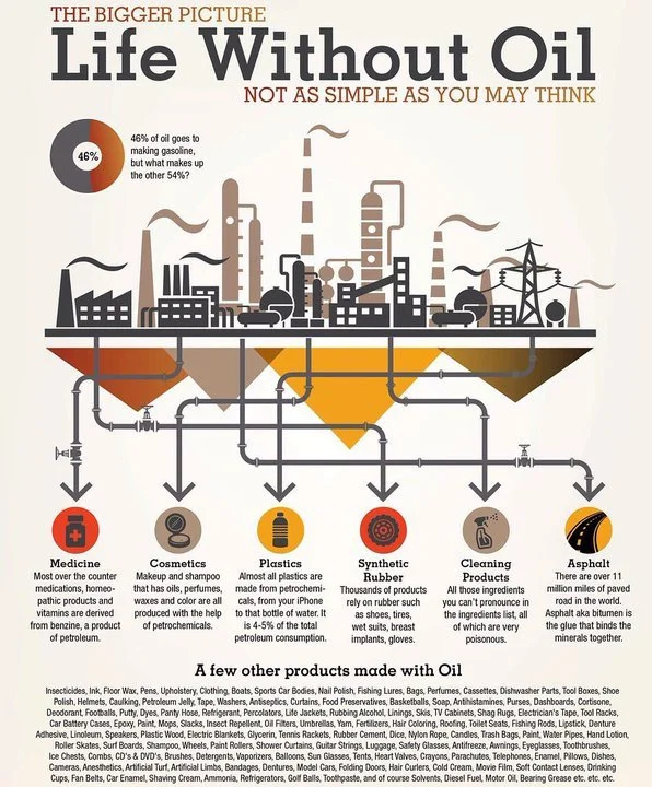 Za posledných 200 rokov, po objavení ropy, vzrástla svetová populácia z 1 na 8 miliárd. Všetky dostupné možnosti výroby energie, ako sú veterné turbíny, solárne panely, jadrová energia, vodné elektrárne, uhlie a zemný plyn, sa pri výrobe elektriny spoliehajú na produkty a komponenty vyrobené z ropy. Alebo chcete v budúcnosti vyrezať lopatky veterných turbín z dreva?