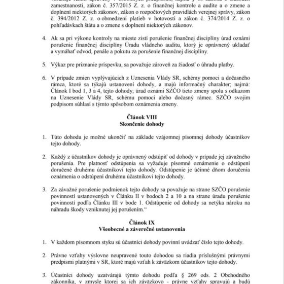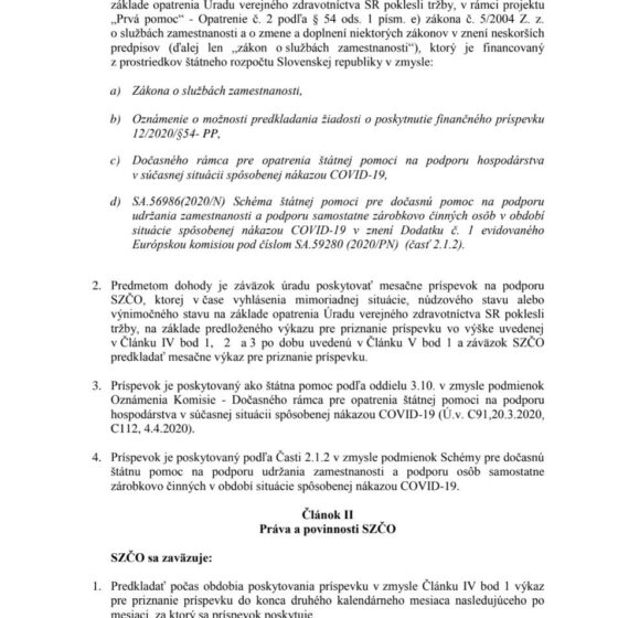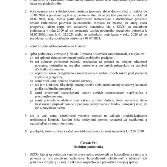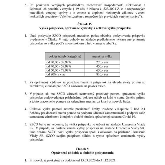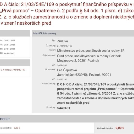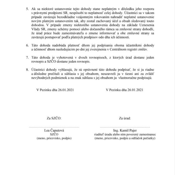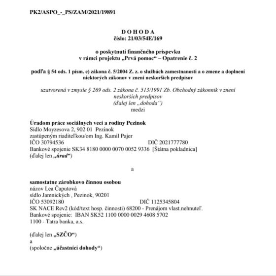 - je taká chudobná – pričom zjavne býva v spoločnej domácnosti s mamičkou a hojne si užíva aj benefity súvisiace s mamkinou pozíciou Prezidentky SR zaplatené z daní zbedačených občanov Slovenska -, že bola chudák Lea ťažkou životnou situáciou prinútená požiadať o príspevok Úrad sociálnych vecí a rodiny a ten jej ho v článku V. predmetnej dohody „priklepol“ na obdobie od 13.03.2020 do 31.12.2021, avšak podľa dostupných záznamov Lea začala podnikať až od 1.6.2020.