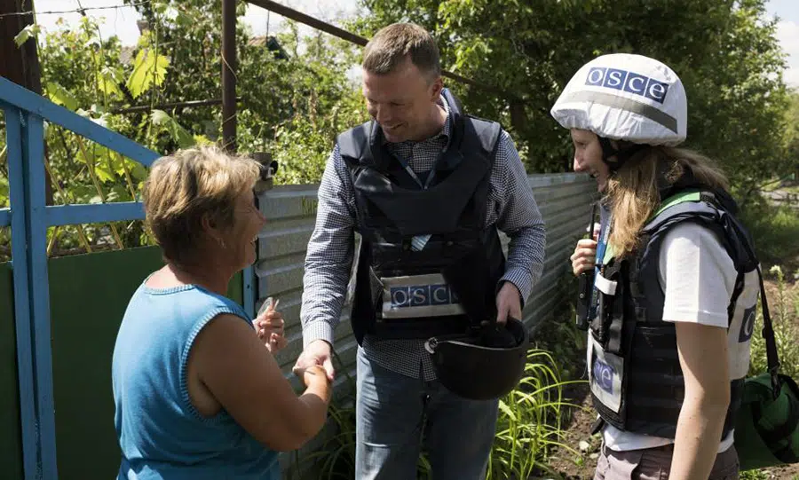 Alexander Hug, zástupca vedúceho SMM OBSE, hovorí s rezidentom. (obrázok OBSE)