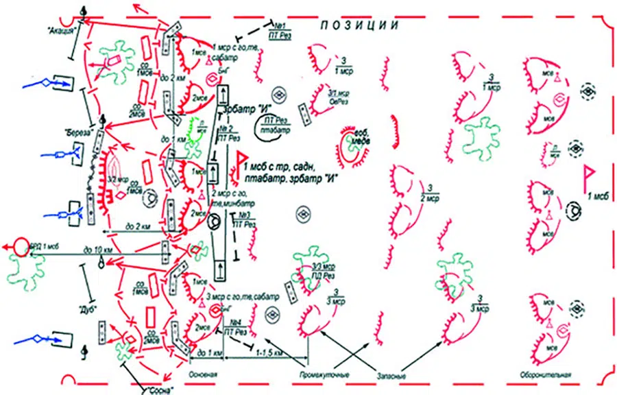 Schéma: Vznik ruského motostreleckého práporu v mobilnej obrane. Takáto operácia sa môže uskutočniť v bezpečnostnom páse pred skutočnými obrannými postaveniami divízie alebo armádneho zboru a jej účelom je chrániť prvé obranné postavenie pred nečakaným útokom. Mierové sily by zrejme najskôr museli pokryť spravodajské potreby tu dislokovaného veliteľa práporu. To umožňuje získavanie správ až do hĺbky 10 km.