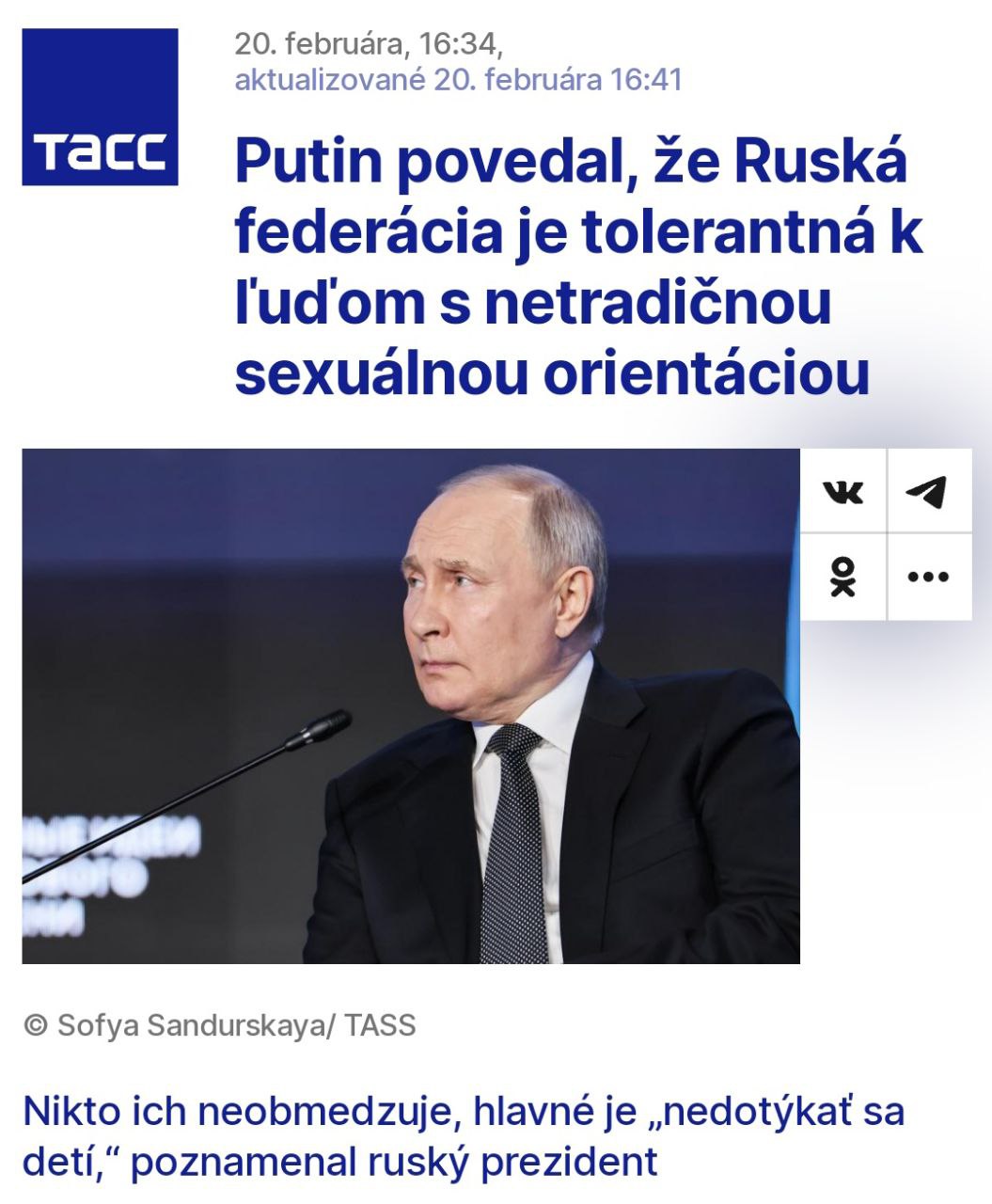 Pre mňa, ako odporcu akejkoľvek formy LGBT agendy, sú tieto slová z úst ruského prezidenta príliš opatrné a umiernené. Autentický tradicionalista by sa ani nemal zapodievať tým či sa nejakí sexuálni degeneráti cítia tolerovaní v jeho krajine alebo nie.