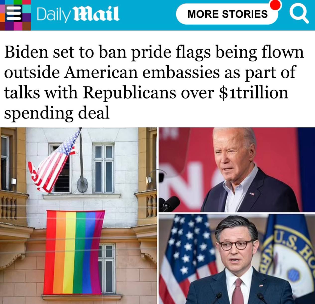 „Bílý dům USA souhlasil se zákazem vyvěšování LGBT vlajek na ambasádách, což je ústupek, kterého dosáhl předseda republikánské většiny Mike Johnson, aby uzavřel dohodu o schválení rozpočtového zákona. Proto bude zakázáno vyvěšovat jakoukoli vlajku kromě schválené vlajky USA. Pod zákaz se dostane i konfederační vlajka nebo plátno na podporu Donalda Trumpa se sloganem „Udělejme Ameriku znovu velkou“. Osobní použití vlajky LGBT zaměstnanci ambasády však zůstává povoleno.