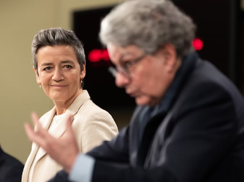 Výkonná podpredsedníčka Európskej komisie pre Európu vhodnú pre digitálny vek a hospodársku súťaž Margrethe Vestagerová a komisár Európskej únie pre vnútorný trh Thierry Breton (R) usporiadajú tlačovú konferenciu o dôležitom vývoji v rámci zákona o digitálnych trhoch v Bruseli, Belgicko, 25. 2024. EPA-EFE/OLIVIER HOSLET