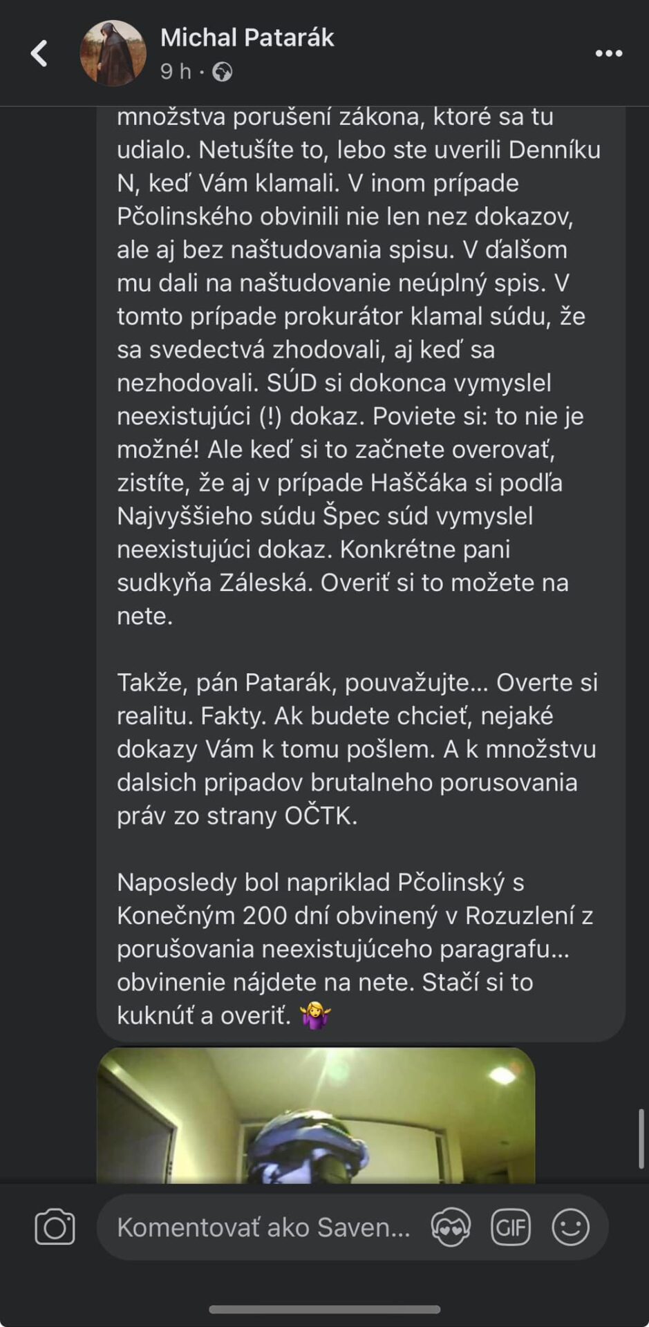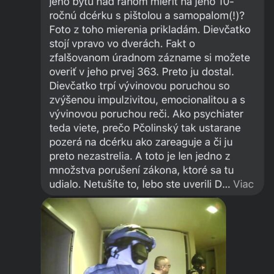 „Len pre info… viete v tom Vašom správnom svete, že stíhanie Pčolinského začalo zmanipulovaným úradným záznamom a teda bolo od začiatku nezákonné a aj tak NAKA s čurillovcom osobne nabehla do jeho bytu nad ránom mieriť na jeho 10-ročnú dcérku s pištolou a samopalom (!)?