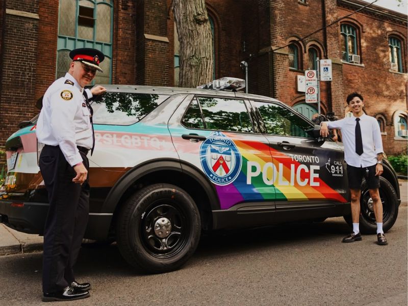 V Toronte sa policajti vyvážajú na takýchto politicky ladených transdúhových autách. Polícia takto „bojuje“ za práva dúhovej komunity. Tá istá polícia, ktorá ešte pred 2 rokmi búchala ľudom na dvere a kontrolovala, koľko ich je v ich vlastných domoch v mene „vedy“.
