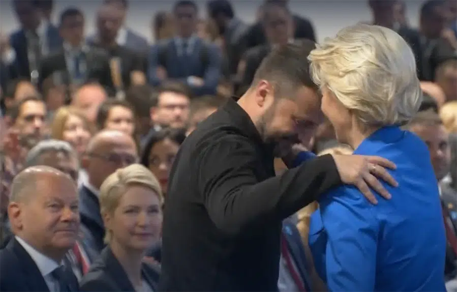 Volodymyr Zelenskyj po tom, čo sa včera v nemeckom Bundestagu vrúcne objali s predsedníčkou Európskej komisie Ursulou Von der Leyenovou. Opäť žiadal podstatne viac zbraní, pričom dobre vedel, že to predĺži vojnu a že pošle na smrť ďalšie desaťtisíce Ukrajincov. Sarah Wagenknechtová a jej ľudia odmietli byť svedkami tohto nechutného predstavenia z jednoduchého, ale pochopiteľného dôvodu: „Vojny sa nekončia zbraňami, vojny sa končia mierovými rokovaniami.“ (Snímka obrazovky z Tagesschau z 11. júna 2024)