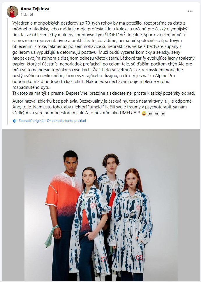 „V zmysle extrémne neštýlového a nevkusného, lacno pôsobiaceho dizajnu, na čo je napokon značka Alpine Pro [popredná česká značka outdoorového a športového oblečenia a tiež partner Českého olympijského výboru, pozn. red.] expert a dlhodobo ničí tunajší vkus,“ nešetrí kritikou žena z módneho priemyslu.