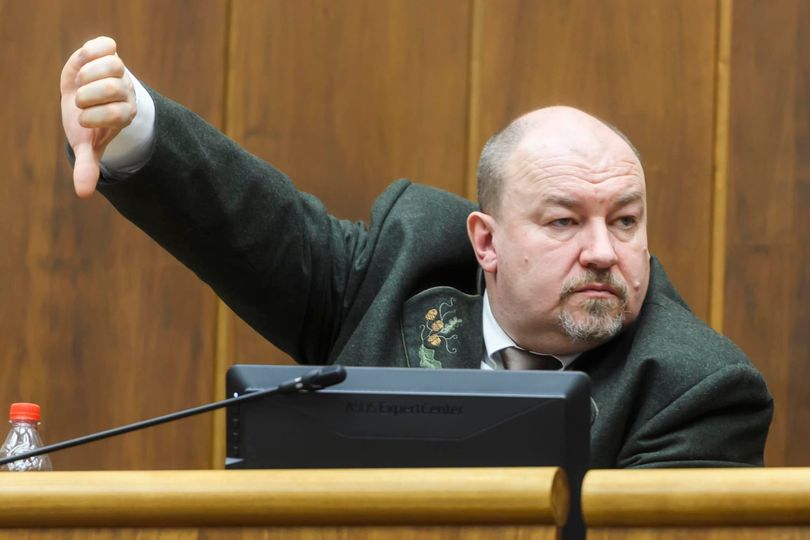 Na snímke poslanec NRSR za SNS Rudolf Huliak počas rokovania 7. schôdze NRSR k návrhu skupiny poslancov Národnej rady Slovenskej republiky na odvolanie Ľuboša Blahu z funkcie podpredsedu Národnej rady Slovenskej v Bratislave 16. januára 2024. FOTO TASR – Jaroslav Novák