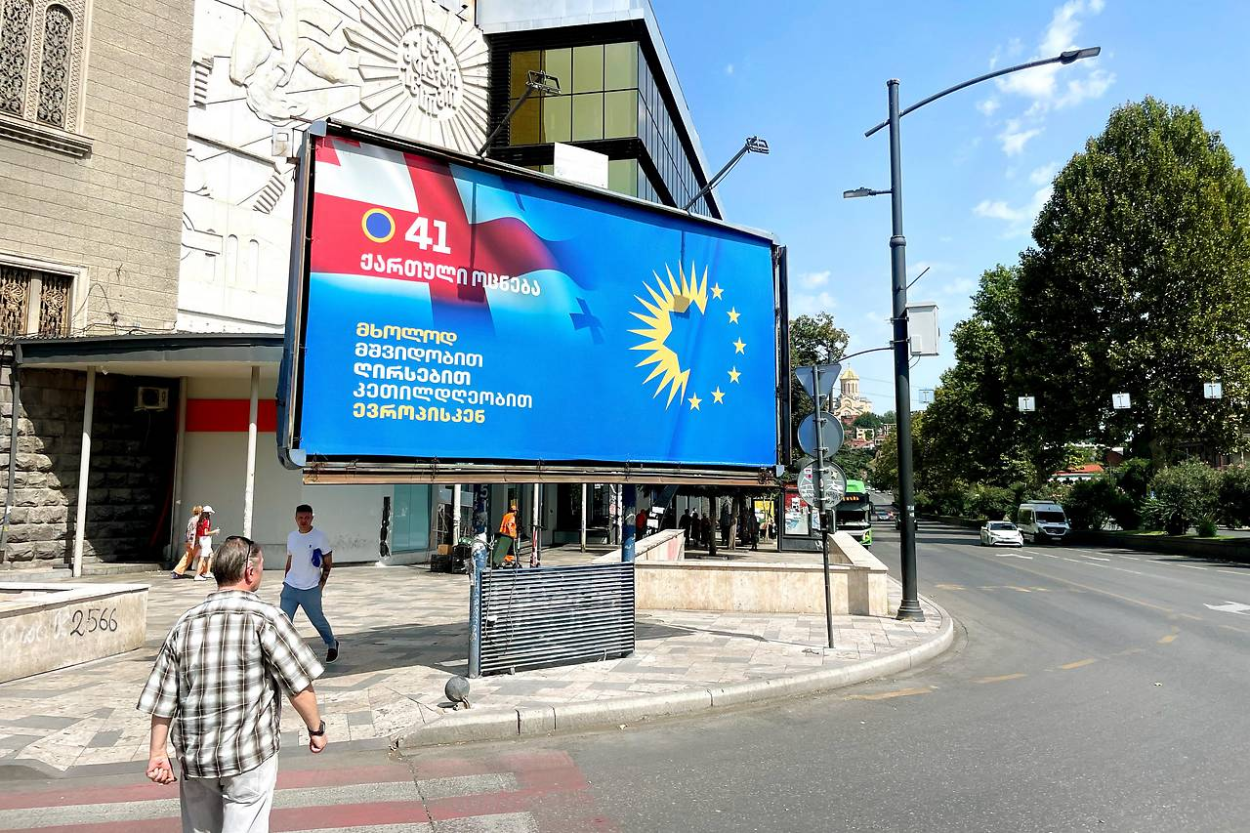 „Spoločne za mierovú, liberálnu a prosperujúcu Európu,“ postuluje Gruzínsky sen na tomto volebnom plagáte