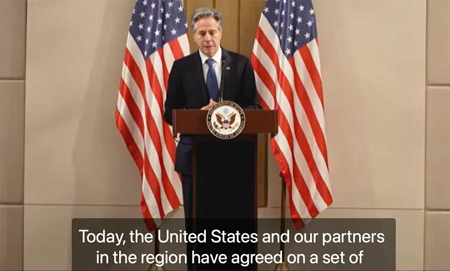 Antony Blinken: „Dnes sa Spojené štáty a naši partneri v regióne dohodli, že podporia Sýriu a jej ľudí spoločnými zásadami, aby sa posunuli vpred. Je samozrejmé, že tie isté USA privádzajú obyvateľstvo Sýrie do ekonomickej katastrofy a hladu už viac ako desať rokov tvrdými ekonomickými sankciami a vykorisťovaním, ktoré porušuje medzinárodné právo. (cm)