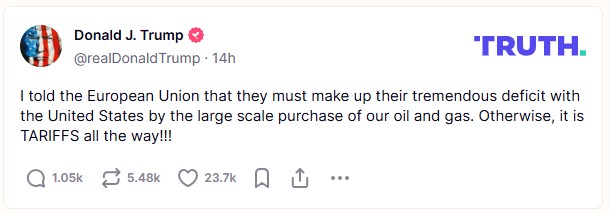 „Povedal som Európskej únii, že svoj obrovský deficit so Spojenými štátmi musia vyrovnať rozsiahlym nákupom našej ropy a plynu,“ uviedol Trump v príspevku na Truth Social.