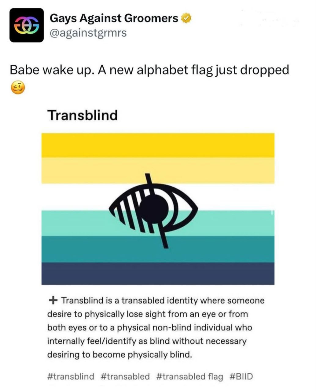 🙈 #TransBlind je identita, kde niekto túži fyzicky stratiť zrak z jedného oka alebo z oboch očí, alebo fyzicky neslepý jednotlivec, ktorý sa vnútorne cíti/identifikuje ako slepý bez toho, aby nutne túžil stať sa fyzicky slepým.