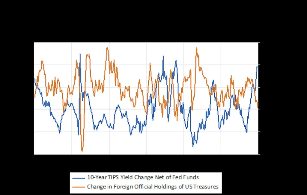 Federálny rezervný systém spôsobil väčšinu nárastu sadzieb zvýšením sadzby, ktorou účtuje bankám peniaze za noc, to je isté. Ale výrazný nárast takzvaného reálneho výnosu štátnych dlhopisov – v tomto prípade úrokovej sadzby na inflačne indexované štátne dlhopisy (TIPS) – je spôsobený zníženými nákupmi amerického dlhu zahraničnými centrálnymi bankami. Zhruba 80 bázických bodov (8/10 percentuálneho bodu) sa vysvetľuje znížením držby amerického vládneho dlhu zahraničnými centrálnymi bankami.