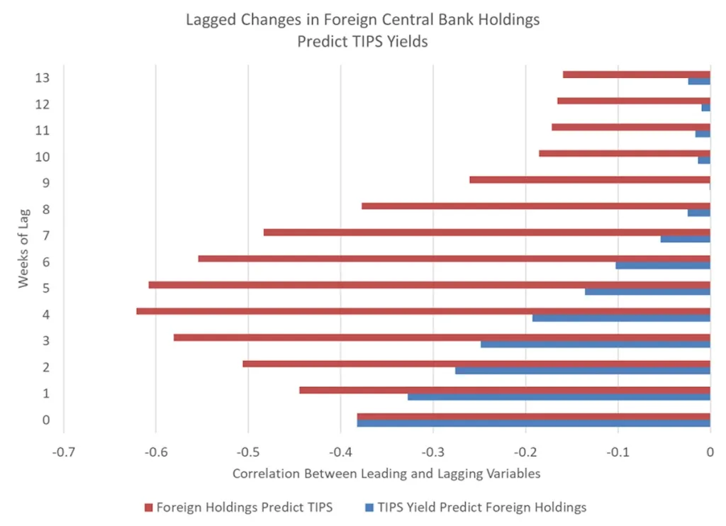 Porovnanie predstihov a oneskorení jasne ukazuje, že zmeny v držbe štátnych dlhopisov zo strany zahraničných centrálnych bánk vedú k zmenám vo výnose TIPS (opäť sledujeme zmeny, ktoré nie sú predpovedané sadzbou federálnych fondov). V nižšie uvedenom grafe každý stĺpec zobrazuje koreláciu medzi súčasnými a oneskorenými hodnotami dvoch premenných v týždenných intervaloch. S 5-týždňovým oneskorením napríklad oneskorená hodnota zmien v držbe štátnych dlhopisov zahraničnej centrálnej banky vykazuje -0,6 koreláciu s výnosom TIPS v danom týždni. Krížový korelogram naznačuje, že zmeny v držbe zahraničných centrálnych bánk predpovedajú budúce výnosy TIPS, a nie naopak.