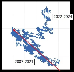 Červená čiara ukazuje šesťtýždňovú zmenu v držbe štátnych dlhopisov zahraničných centrálnych bánk, ako uvádza Fed. Modrá čiara zobrazuje časť výnosu 10-ročných TIPOV, ktorá nie je vysvetlená zmenami sadzby federálnych fondov (jednodňová sadzba, ktorú Fed účtuje bankám). K 1. januáru boli 10-ročné výnosy TIPS o 80 bázických bodov vyššie, ako predpovedala sadzba federálnych fondov (modrá čiara je opäť zmena vo výnose TIPS, ktorá nie je vysvetlená sadzbou federálnych fondov). Ekonometrické testy ukazujú, že vzťah medzi týmito dvoma premennými je významný na úrovni spoľahlivosti 95 %.
