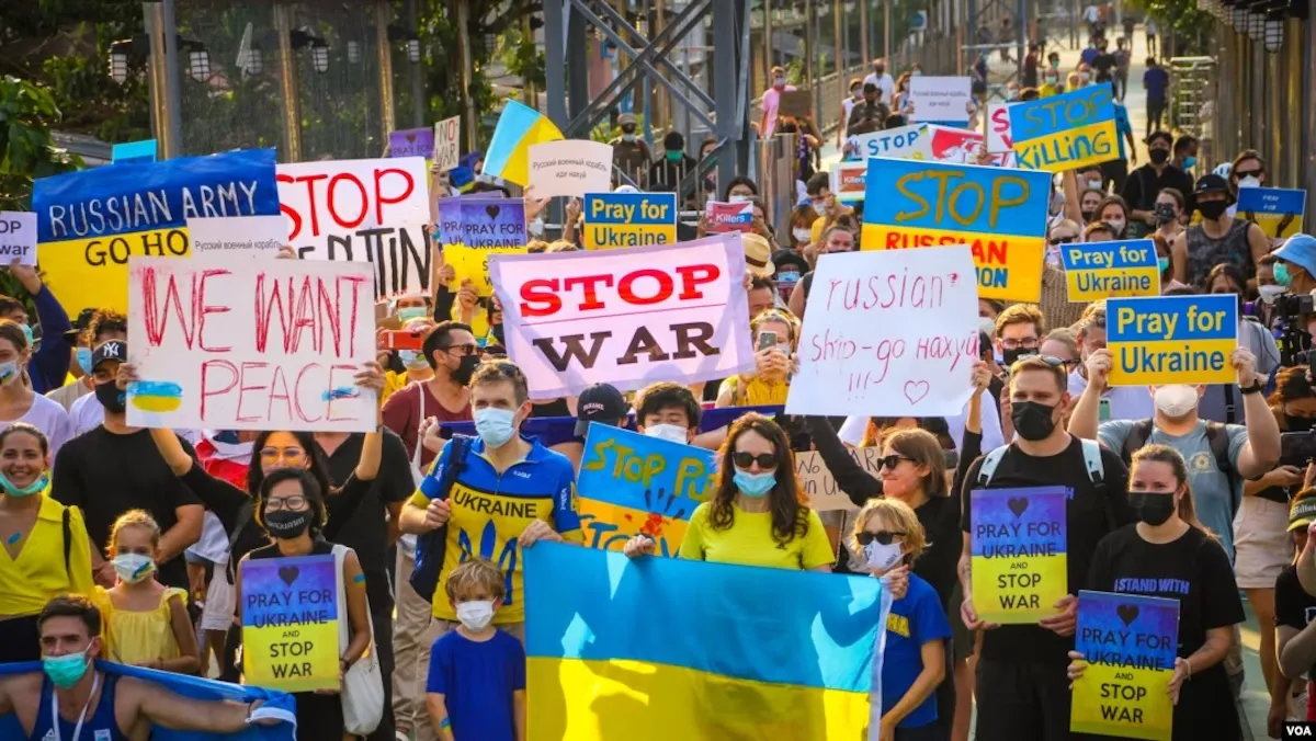 Potrestanie útočníkov mohlo byť dobré, ale stálo to Spojené štáty. Tu sú znázornení Ukrajinci nesúci nápisy proti vojne na Ukrajine a ruskému prezidentovi Vladimirovi Putinovi počas pouličného pochodu v Bangkoku 27. februára 2022 po ruskej invázii na Ukrajinu. Foto: Tommy Walker / VOA