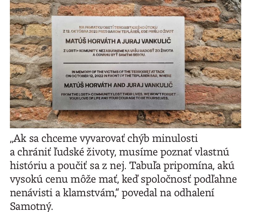 V Bratislave odhalili pamätník Matúša Horvátha a Juraja Vankuliča, ktorí zahynuli pri teroristickom útoku v októbri 2022.