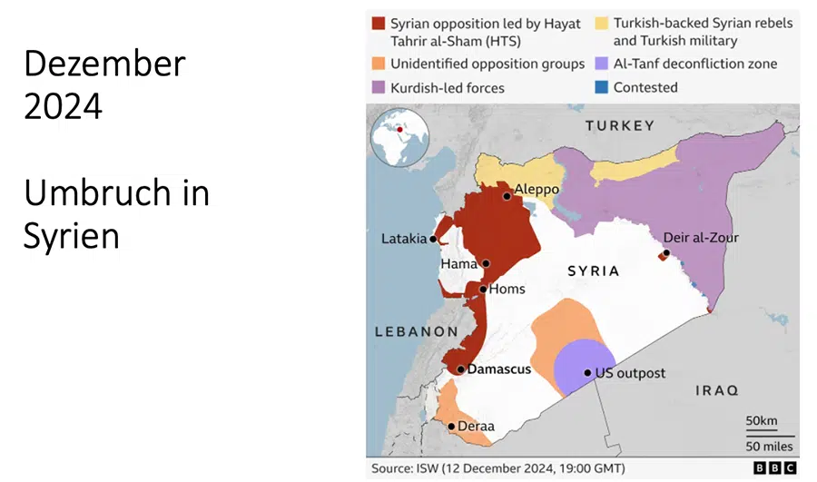 Jedným z bezprostredných geopolitických dôsledkov Asadovho úteku je však úplný kolaps Sýrie a jej (politického) postavenia. Sýrsky región sa zmenil na konfliktnú zónu medzi Izraelom a Tureckom, ktorá zároveň slúži ako nárazníková zóna medzi oboma stranami. Budúcnosť Sýrie vo veľkej miere závisí od prebiehajúcich rokovaní, ako aj od súťaženia o rozdelenie krajiny do sfér vplyvu. Línie kontaktu alebo konfliktu medzi oboma stranami ešte nie sú jasne vyznačené.