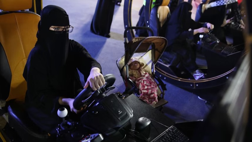 Saudská žena v nikábe skúša šťastie na simulátore jazdy. V Nemecku to radšej neskúšajte v aute! (Foto: Sean Gallup/Getty Images)