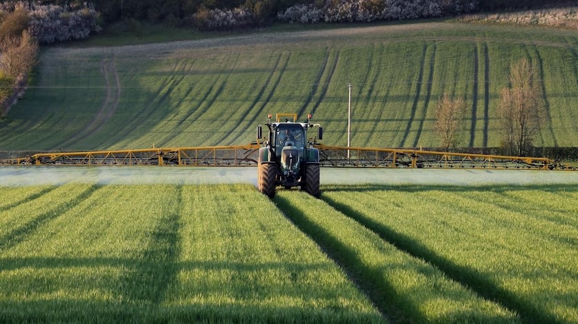 Farmár postrekuje svoje úrody hnojivom. Anglicko. (Gettyimages SteveAllenPhoto)