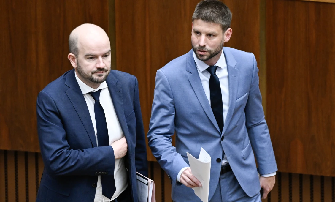 FOTO TASR – Pavel Neubauer | Na snímke zľava poslanec NRSR Martin Dubéci a podpredseda NRSR Michal Šimečka (obaja PS) počas mimoriadnej schôdze k návrhu na odvolanie Michala Šimečku z postu podpredsedu parlamentu vo štvrtok 12. septembra 2024 v Bratislave.
