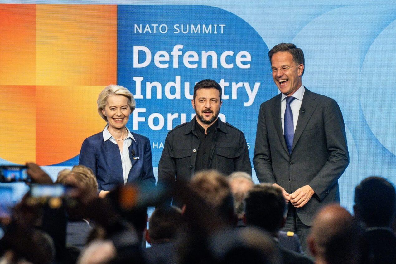 „Zelené dodávky pre frontovú líniu?“ – Von der Leyen, Zelenskyj a Rutte na summite obranného priemyslu NATO v Haagu. APA/AFP/ANP/JONAS ROOSENS