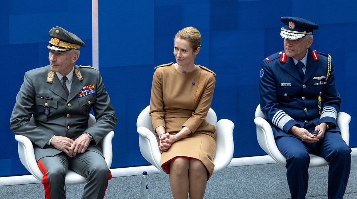 Cosplay? Kaja Kallasová, úradníčka EK pre zahraničné veci a bývalá premiérka malého Estónska, predstierajúca, že je ministerkou zahraničných vecí, sedí s dvoma generálmi EÚ, ktorí nevelia ozbrojeným silám. (Foto: Omar Havana/Getty Images)