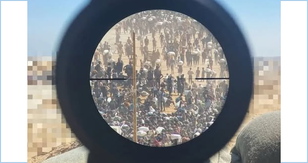 (Snímka je fotografiou izraelského snipera, ktorý mieri na hladujúcich Palestínčanov čakajúcich na potravinovú pomoc.)
