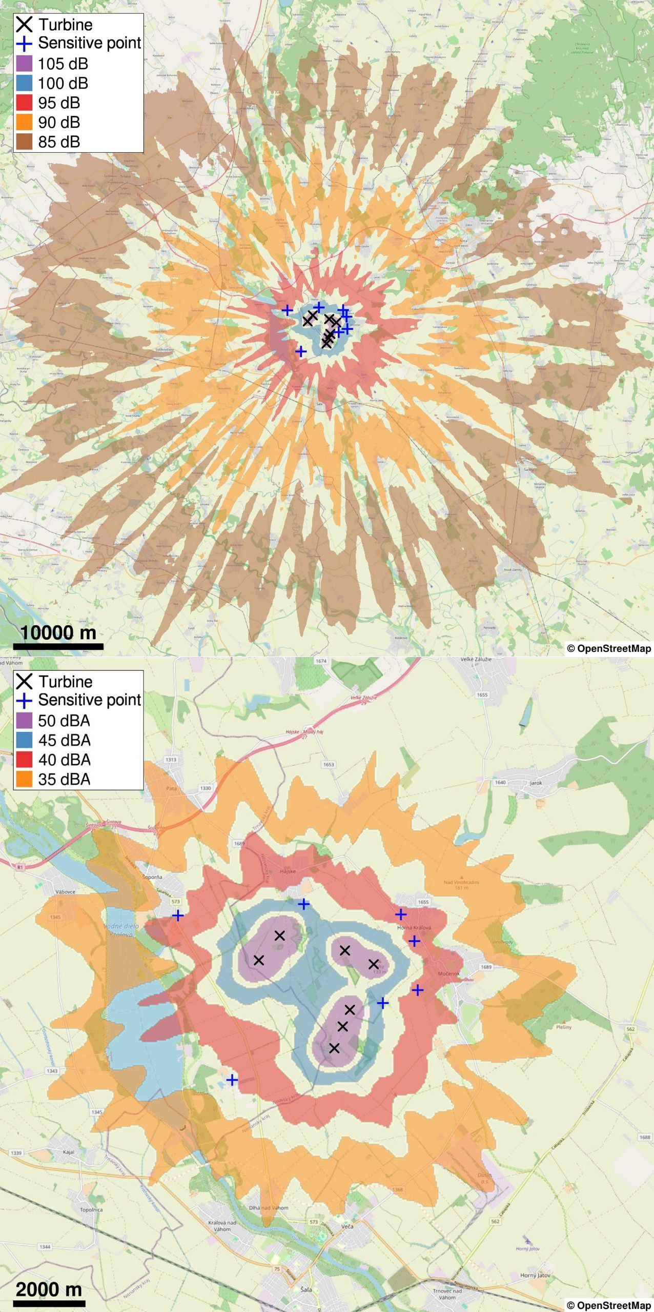 Úroveň infrazvuku 95dB (pozor, to je nie je dBA, ako bežne poznáte, ktorá sa znižuje pre ľudské počutie) je vedecky potvrdené, že poškodzuje zdravie. Ako vidíte, hranica od zdroja je cca 10km! Pričom sú dôkazy, že aj nižšie úrovne spôsobujú problémy, ale už menšiemu počtu ľudí. Druhý obrázok je teda mapa predpokladaného územia najviac zaťaženého našou VTE. Nie, nie je to 1km a ani 3km podľa bývalej smernice (naše smernice vôbec neberú do úvahy výkon)