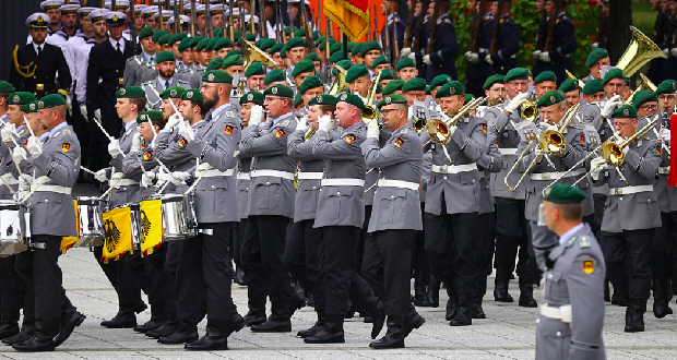 Príslušníci čestnej stráže sa 20. júla 2025 v Berlíne zúčastňujú na skladaní prísahy nových regrútov Bundeswehru, nemeckých ozbrojených síl. (Foto: Christian Mang/Getty Images)