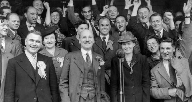 Víťazstvo labouristov Clementa Attleeho nad konzervatívcami Winstona Churchilla vo voľbách konaných pred koncom druhej svetovej vojny. (Foto: Central Press/Getty Images)