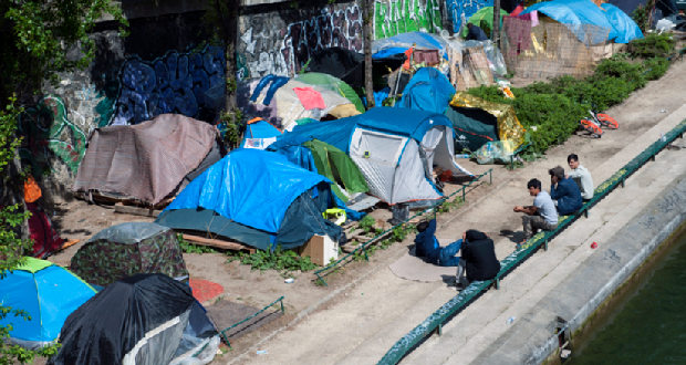 Utečenecký tábor pri kanáli Saint-Martin. Utečenci si postavili stany a stovky utečencov v nich spia (SanerG-Getty Images)