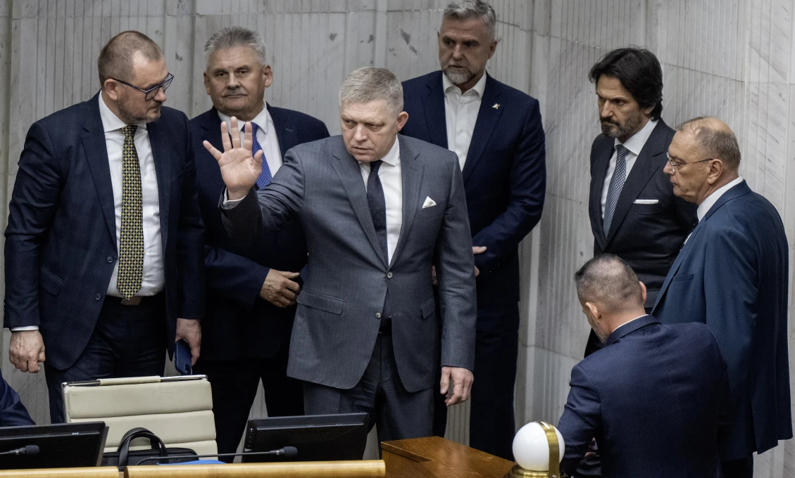 FOTO TASR – Martin Baumann | Na snímke zľava poslanci NR SR Marián Saloň, Ján Richter, premiér SR Robert Fico, podpredseda NR SR Tibor Gašpar, minister obrany SR Robert Kaliňák, poslanec NR SR Ľubomír Vážny (všetci Smer-SD) a poslanec NR SR Branislav Becík (Hlas-SD) počas prestávky na 33. schôdzi NR SR 26. marca 2025 v Bratislave. Predsedom Národnej rady (NR) SR sa v stredu stal podpredseda Hlasu-SD Richard Raši. V tajnej voľbe získal hlas od všetkých 79 poslancov, ktorí boli prítomní na hlasovaní. Na zvolenie potreboval získať aspoň 76 hlasov.