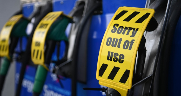 Prázdne palivové stojany sú na čerpacej stanici v Londýne v Británii označené ako nepoužívané. EPA/NEIL HALL