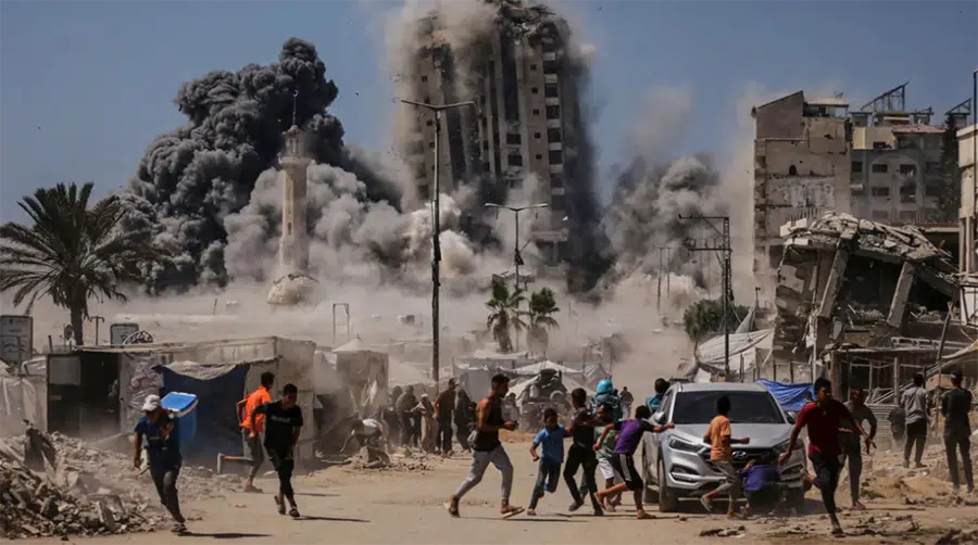 Nedávna fotografia z Gazy z 5. septembra 2025, na ktorej Izrael teraz bombarduje mesto v ešte väčšom rozsahu, ktorú zverejnil denník „The Marietta Times“ (AP/Yousef Al Zanoun)