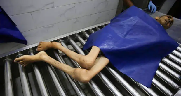 Telo 28-ročného Palestínčana Hamadu Naela Warsha Aghu bolo prevezené do nemocnice Al-Shifa v meste Gaza na pohreb po tom, čo 26. augusta 2025 zomrel na podvýživu spôsobenú blokádou a izraelskými obmedzeniami, ktoré výrazne obmedzili prístup k základným potravinám v Gaze. (Foto Omar Ashtawy/APA; Mondoweiss)