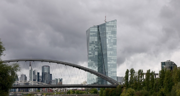 Sídlo Európskej centrálnej banky (ECB) (v strede) za mostom na rieke Mohan vo Frankfurte nad Mohanom v Nemecku, 11. septembra 2025. EPA/RONALD WITTEK