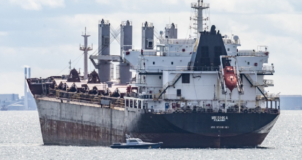 Plavidlo pobrežnej stráže vedľa nákladnej lode Meshka po tom, čo 31. mája 2025 narazila na plytčinu pri prístave Landskrona vo Švédsku. Loď smerovala na juh cez Oeresund do ruského prístavu vo Fínskom zálive, keď z neznámych dôvodov narazila na plytčinu pri Landskrone. EPA/Johan Nilsson/TT SWEDEN