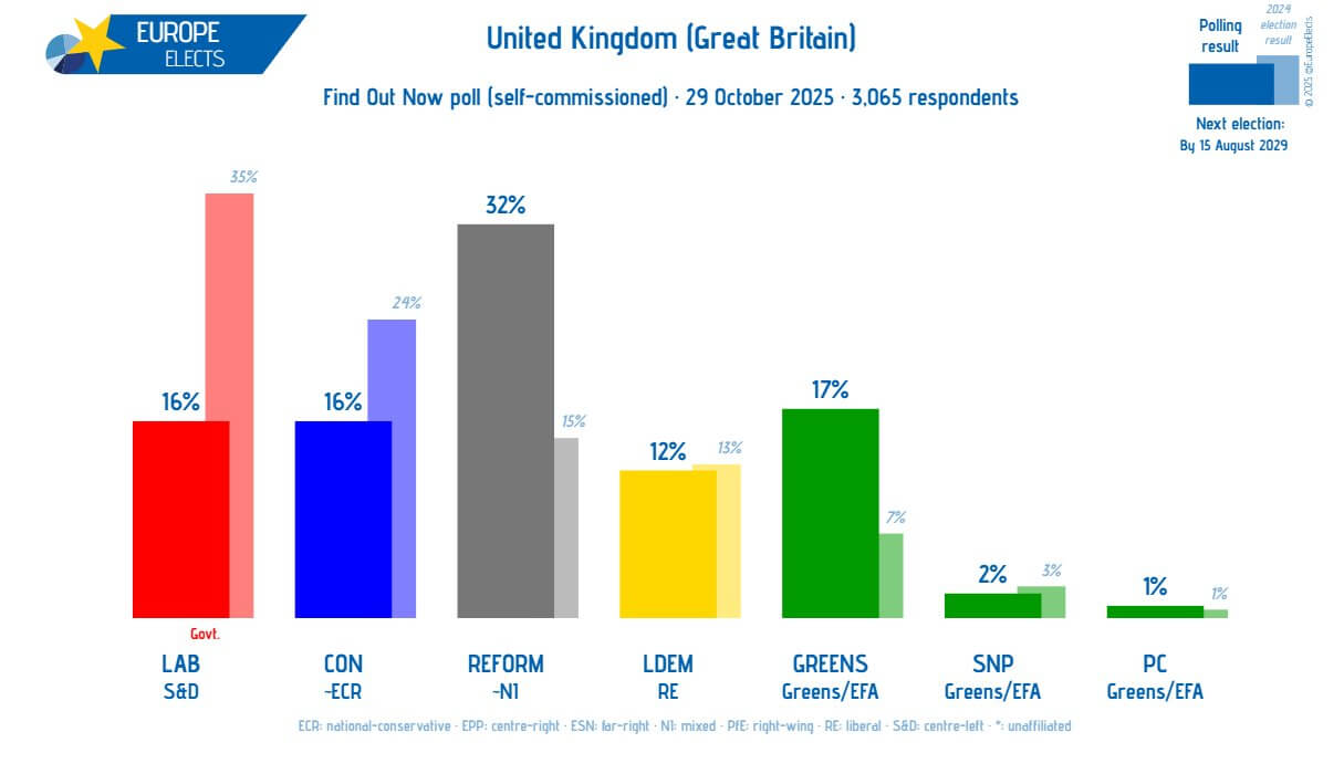 Britániou otriasa politické zemetrasenie. Podľa najnovšieho prieskumu Find Out Now z 29. októbra 2025 dosiahlo hnutie Reform UK Nigela Faragea senzačných 32 percent – nový rekord. To znamená, že Farage nielenže predbehol tradičné strany, ale po prvýkrát jasne dominuje politickej scéne.