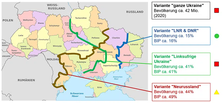 Mapa: Rozdelenie Ukrajiny a vojenská uskutočniteľnosť. Zdroj: Autor (3), údaje z roku 2020