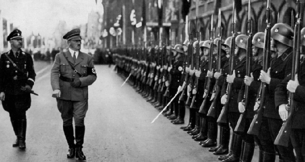 Adolf Hitler pri prehliadke jednotiek SS v roku 1935. (Foto: The Print Collector/Print Collector/Getty Images)