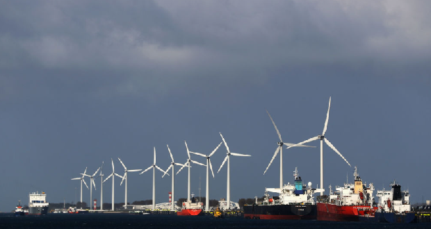Celkový pohľad na veternú farmu s piatimi turbínami v prístave Rotterdam. (Foto: Dean Mouhtaropoulos/Getty Images)