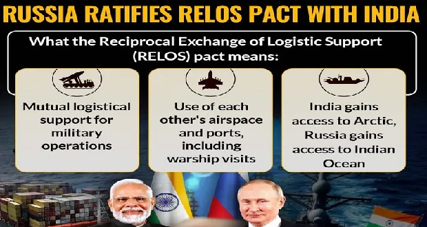 Rusko ratifikovalo dohodu o recipročnej výmene logistiky (RELOS) s Indiou začiatkom decembra prakticky v predvečer Putinovej cesty do tejto krajiny, a preto sa správa o nej stratila v mediálnom chaose. Ako už názov napovedá, RELOS poskytuje jednotkám, lodiam a lietadlám každej krajiny logistický prístup k zariadeniam druhej krajiny, ale čo je dôležité, nedáva im vlastné vojenské základne na území druhej krajiny. Účelom je uľahčiť organizáciu spoločných cvičení s cieľom ich častejšieho konania.
