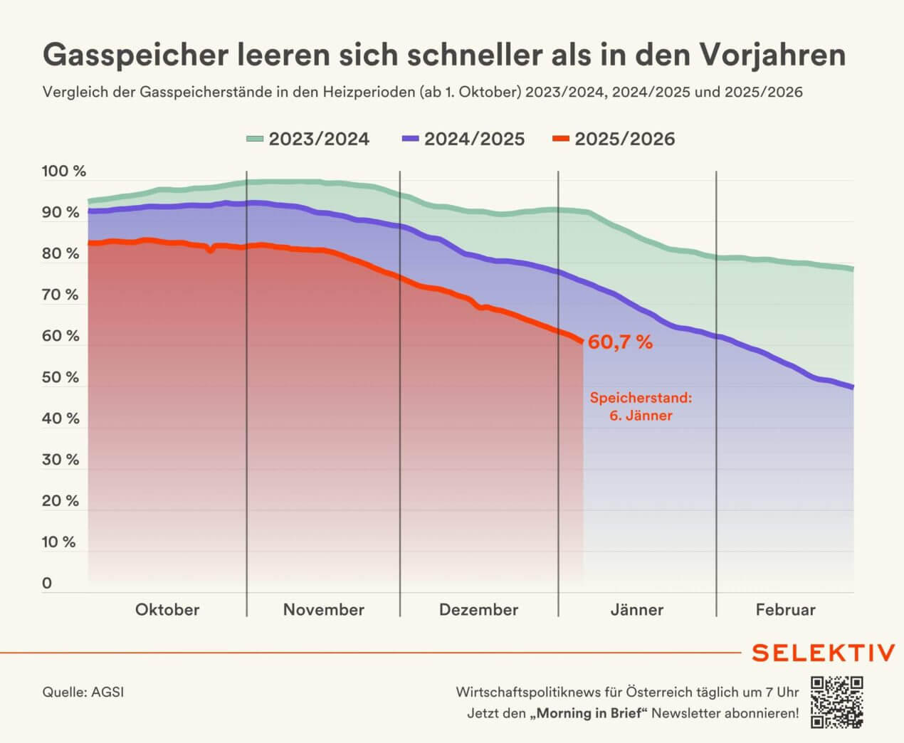 Zásobníky plynu v Rakúsku sa tento rok tiež vyprázdňujú výrazne rýchlejšie ako v predchádzajúcich dvoch rokoch. (Slektiv.at/Grafik)
