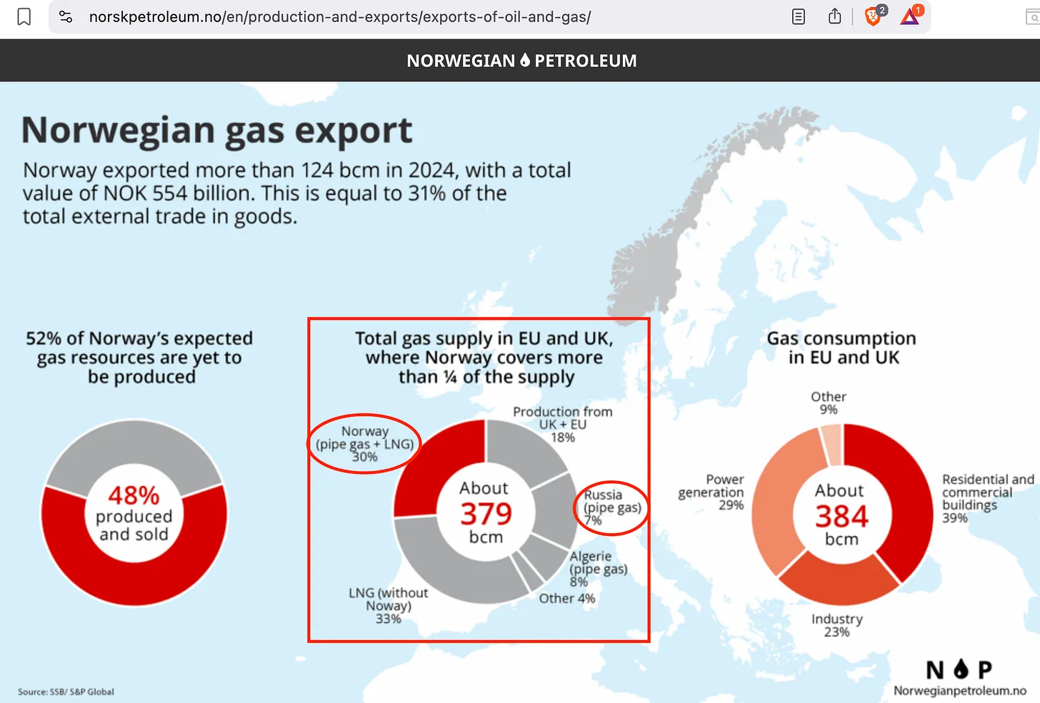 V roku 2024 dodalo Nórsko približne 30 % celkových dodávok zemného plynu do EÚ a Spojeného kráľovstva, zatiaľ čo ruský plyn z plynovodov prispel ďalšími 7%.