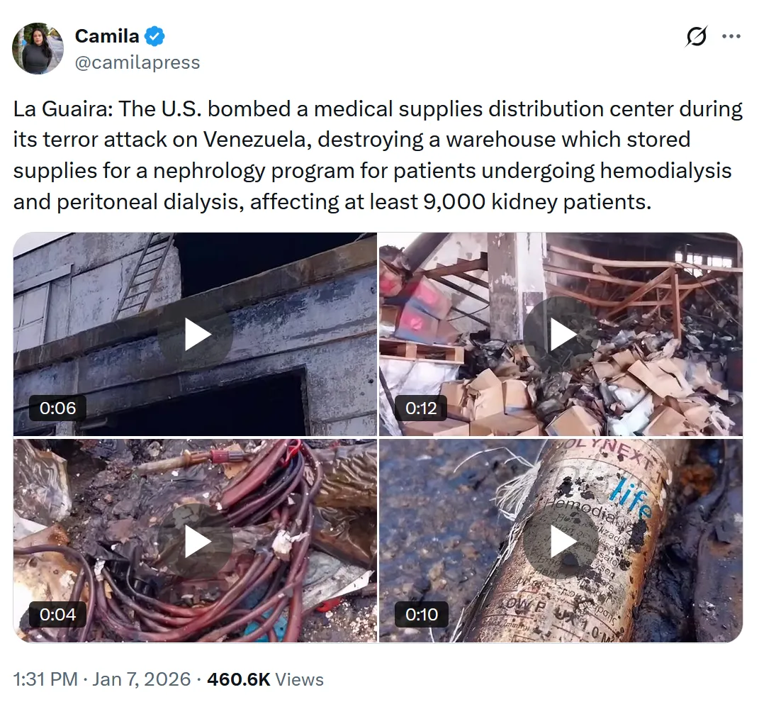 Medzi civilnými oblasťami, ktoré zasiahla americká armáda, bol aj zdravotnícky sklad s zásobami pre venezuelských dialyzovaných pacientov. Tisíce civilistov by teraz mohli zomrieť, pretože už nemajú prístup k tejto život zachraňujúcej liečbe.